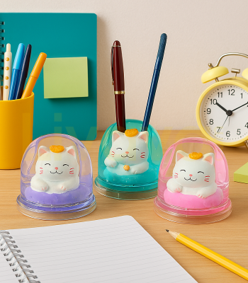 Kedicik Mini Sulu Kalemlik, Kar küresi Efektli Dekoratif Masaüstü Aksesuarı, 8 cm