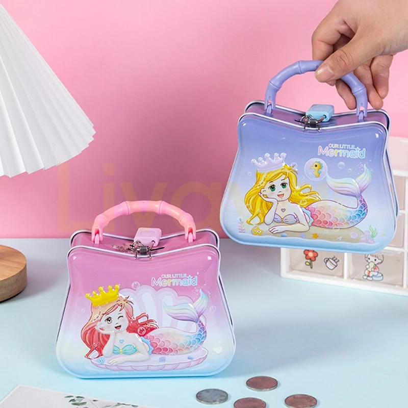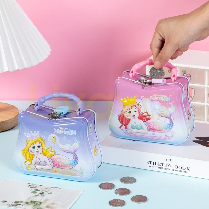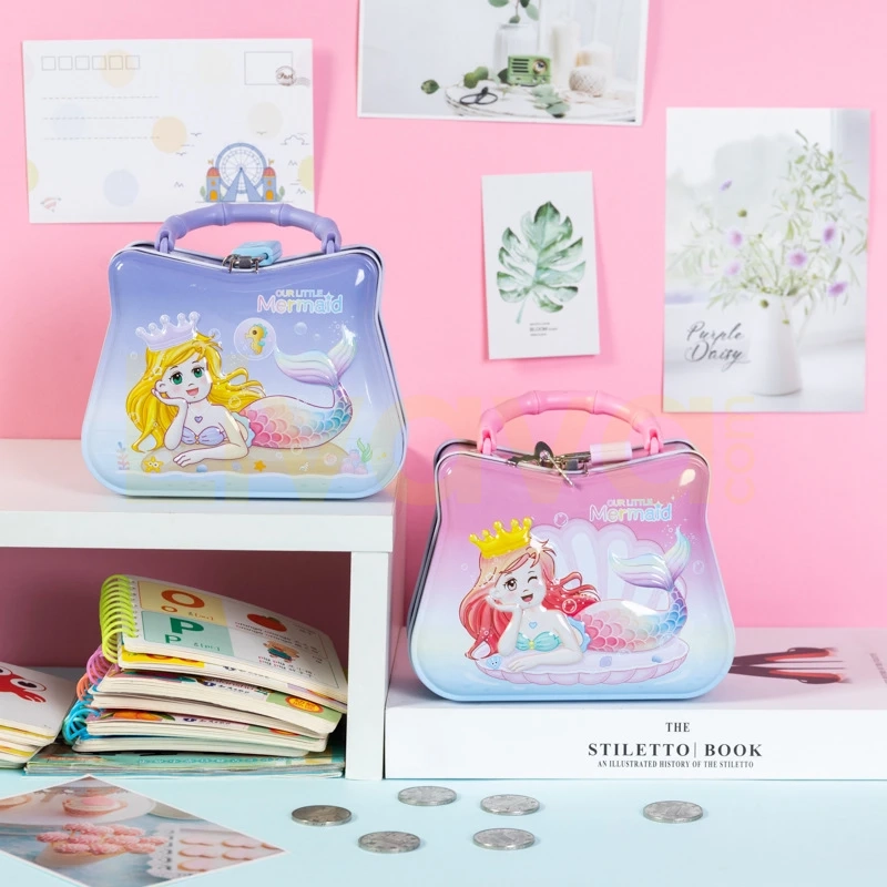 Deniz Kızı Figürlü Metal Kumbara – Çantalı ve Anahtarlı Çocuk Tasarruf Kutusu