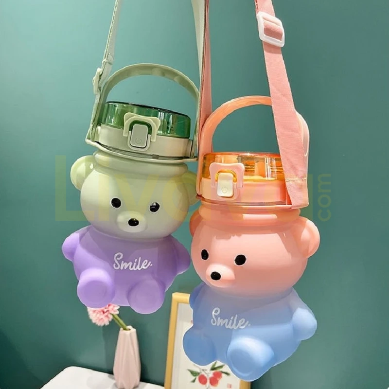 Ayıcık Tasarım Pipetli Çocuk Matarası – Ayarlanabilir Askılı Sızdırmaz Suluk