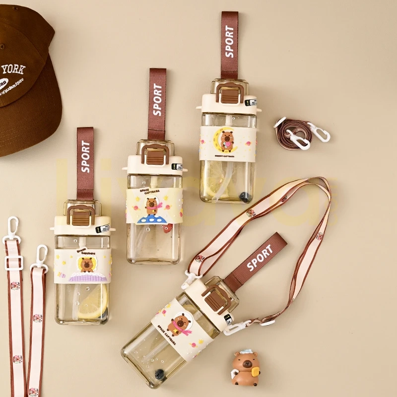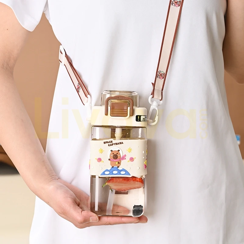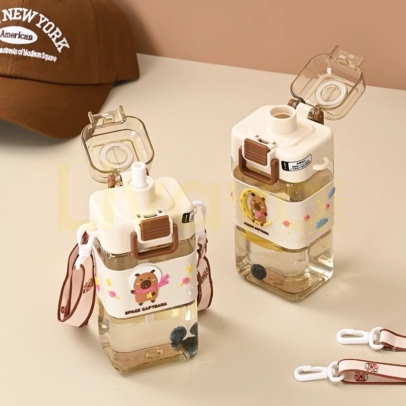 Capybara Figürlü Kare Çocuk Su Matarası – Pipetli, Askılı ve Sızdırmaz Tritan Suluk